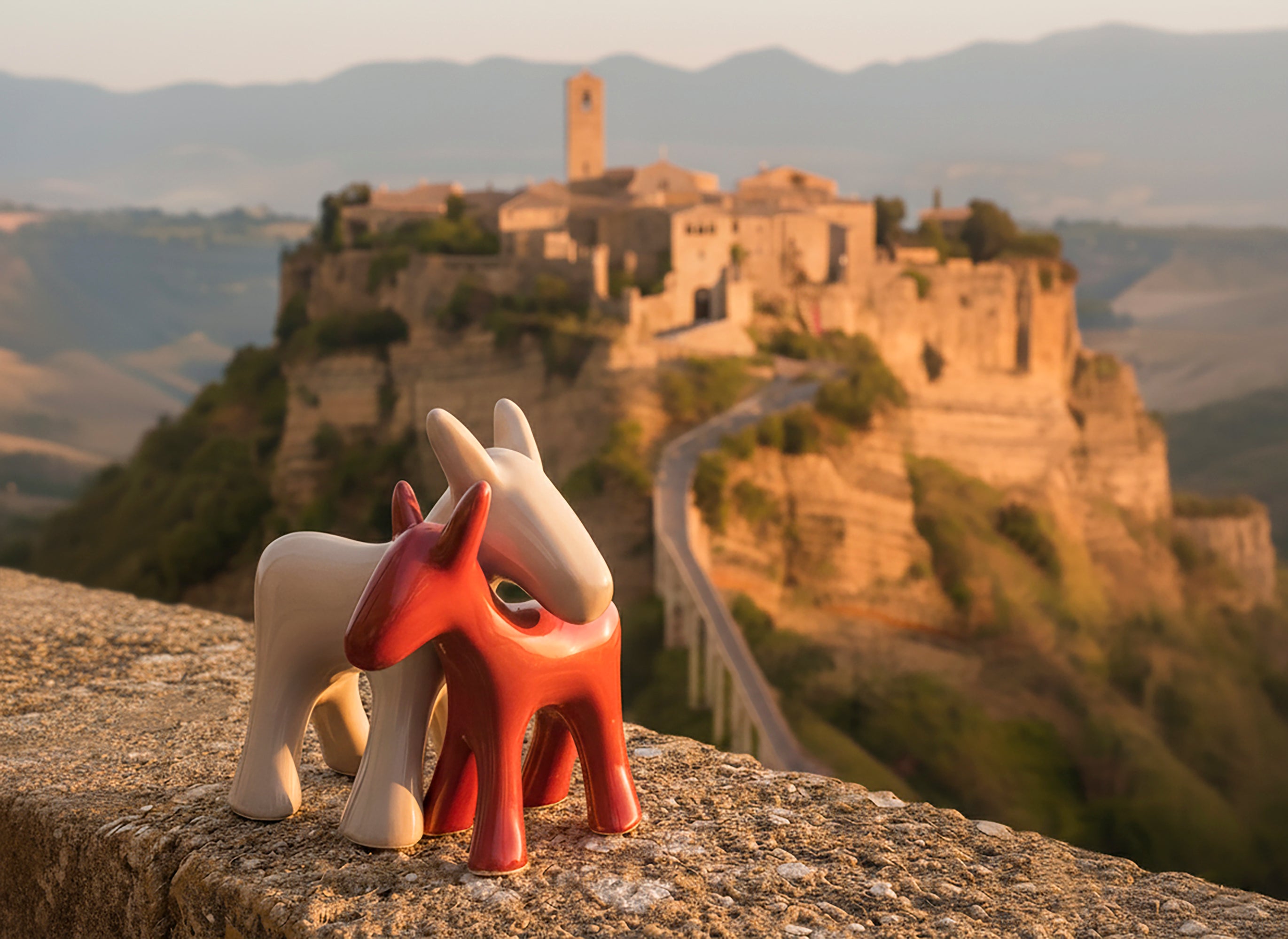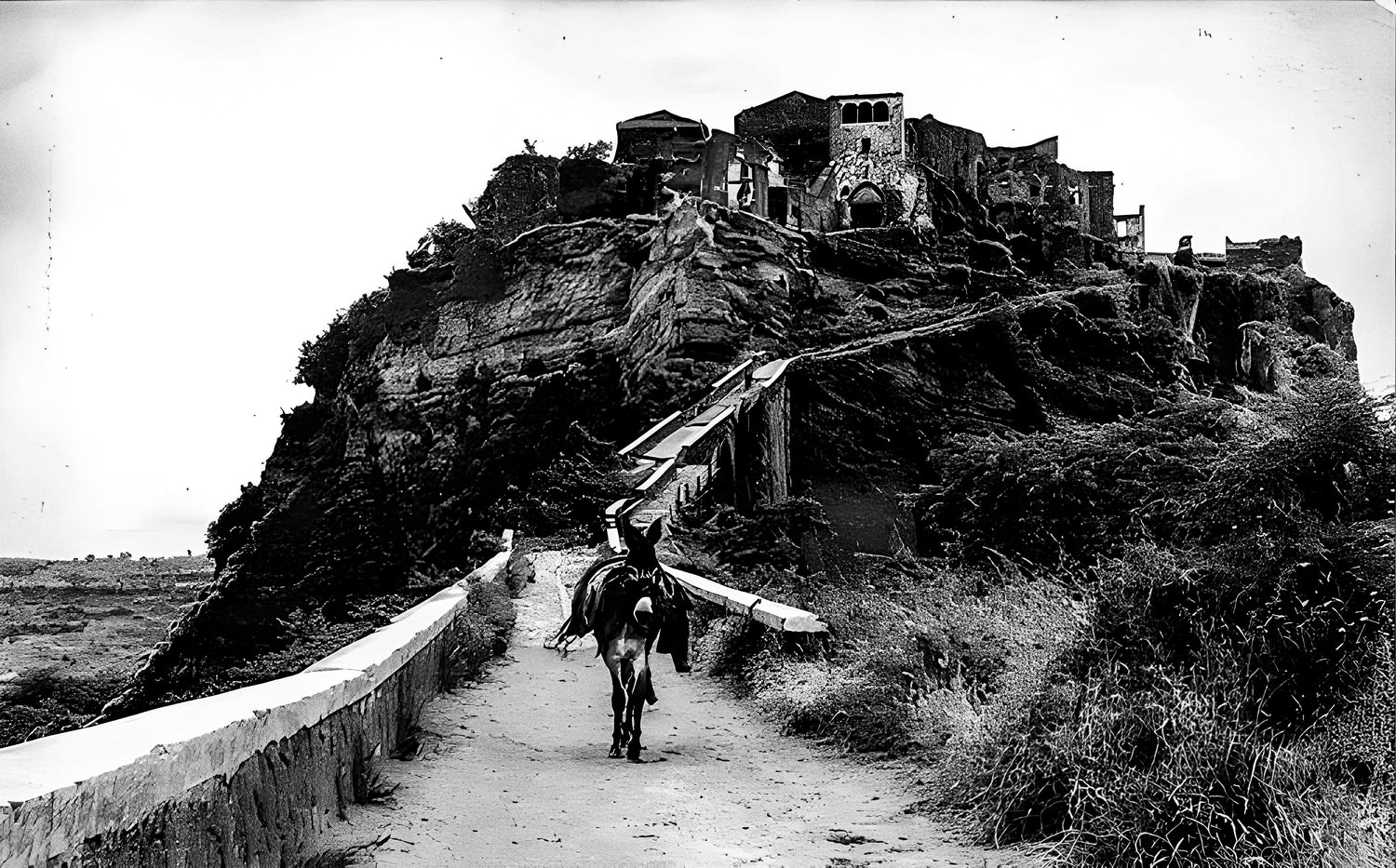 Un tempo, gli asini, erano indispensabili non solo per i lavori rurali tra orti, viti e olivi ma anche per il trasporto di cibo e beni di prima necessità. Prima della costruzione del ponte negli anni ’60, l’asino era infatti l’unico mezzo per raggiungere Civita di Bagnoregio, portando sulle sue spalle il peso della vita quotidiana e della piccola economia locale. Animali fedeli e instancabili, facevano parte della famiglia, tanto da avere nomi propri come “La Peppa” o “La Rufina”.