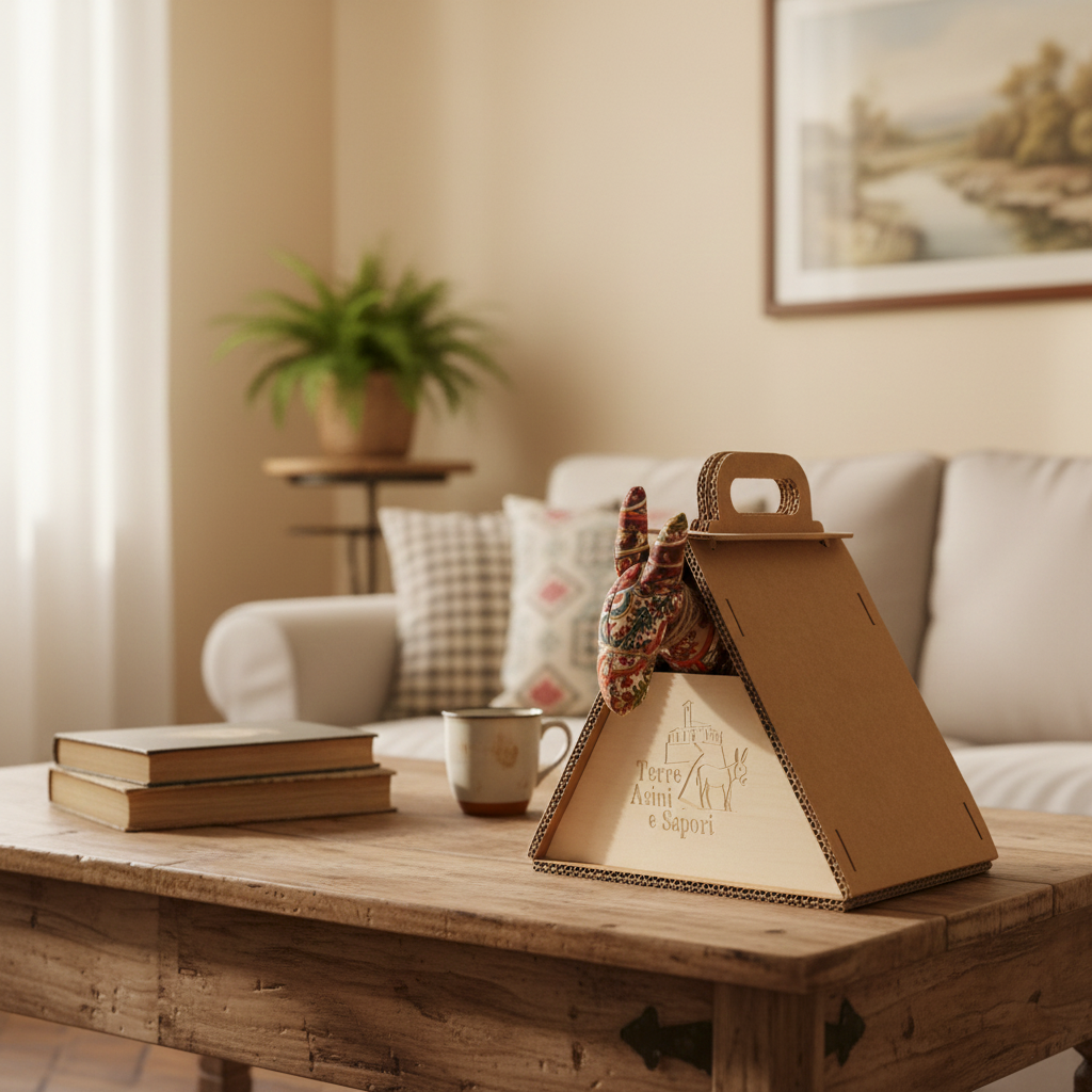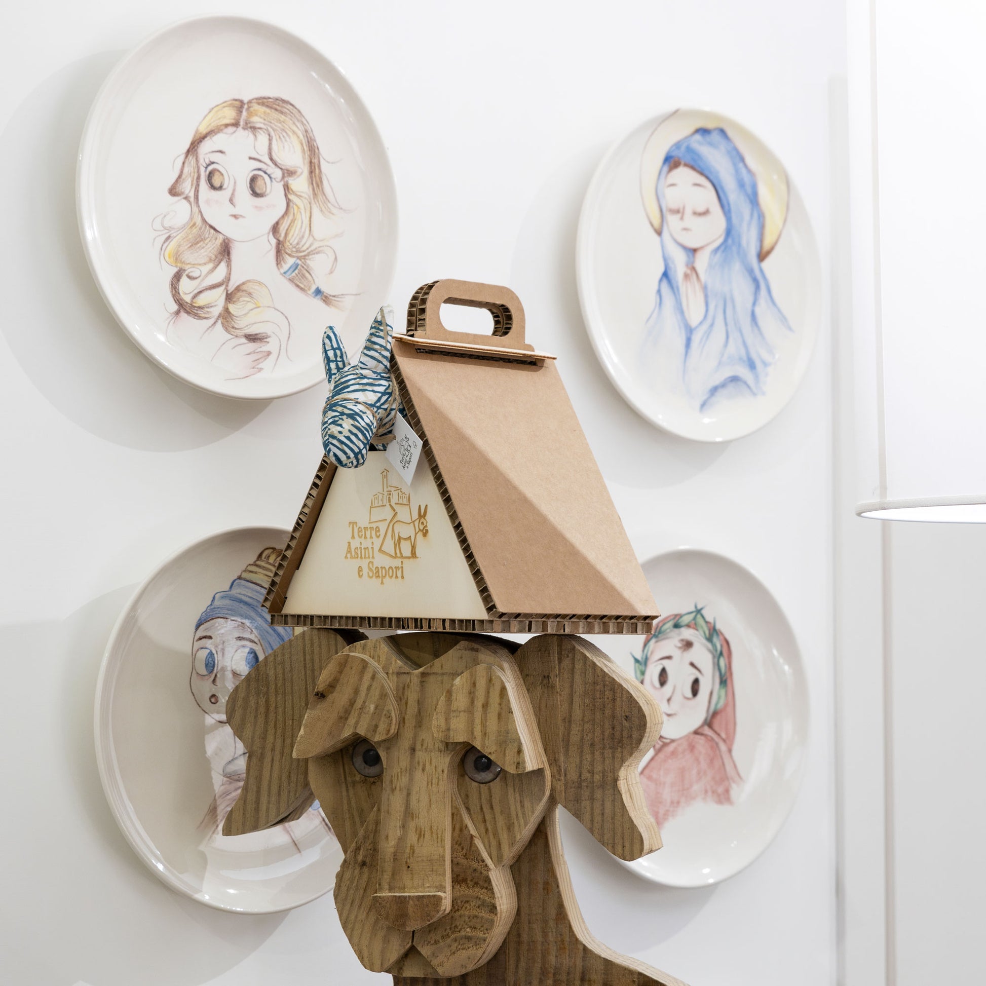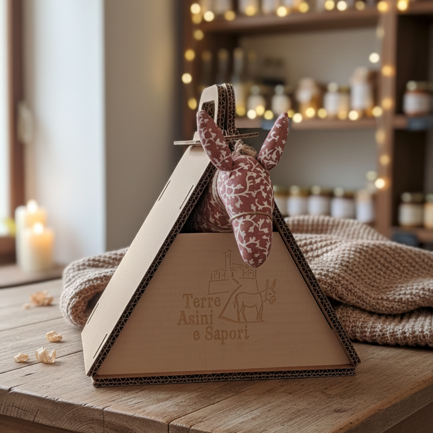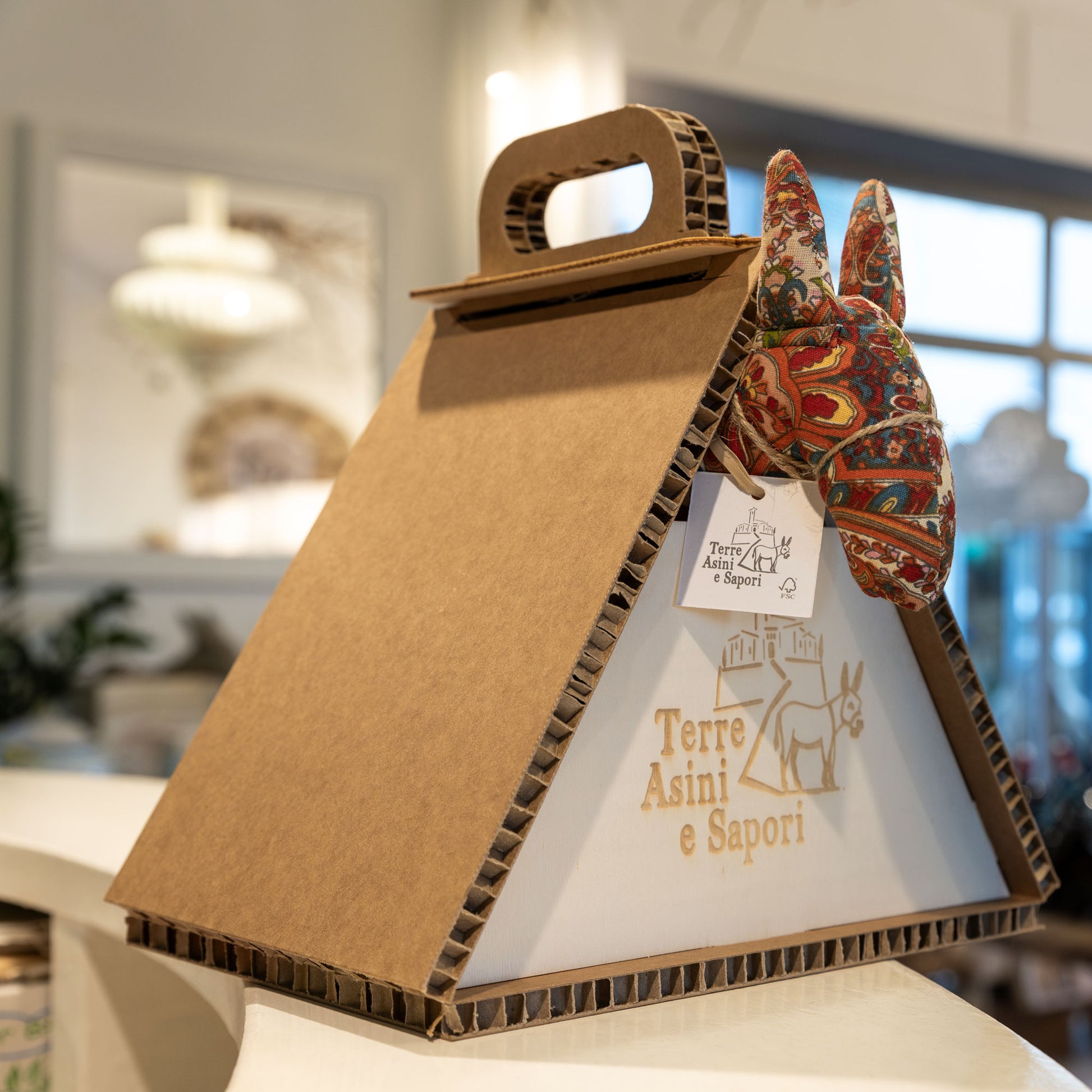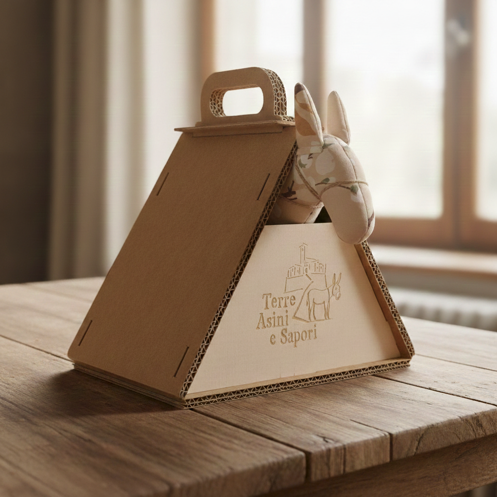 La stalla, progettata appositamente per contenerlo, è realizzata in legno e cartone pressato ed è personalizzata con il logo del nostro laboratorio. È ideale come confezione regalo, come elemento decorativo o come piccola scenografia da esporre in casa.